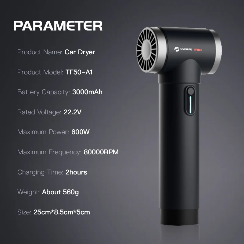 BOOSTER Turbo Dryer Blower for Car 4 Speeds 170 ft/s Wind Speed Car Dryer Air Blower 600W & 50mm Large Diameter Ducted Brushless